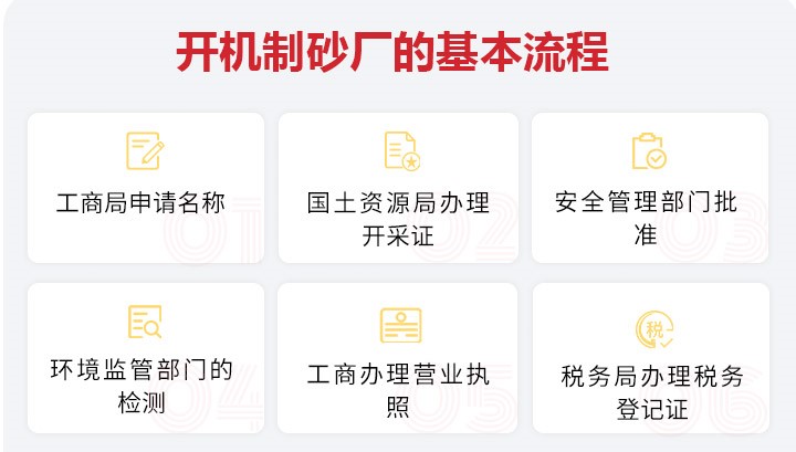工商局申請(qǐng)名稱→國(guó)土資源局辦理開(kāi)采證→安全管理部門批準(zhǔn)→環(huán)境監(jiān)管部門的檢測(cè)→工商辦理營(yíng)業(yè)執(zhí)照→稅務(wù)局辦理稅務(wù)登記證。