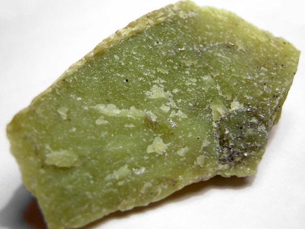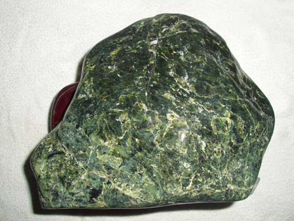 蛇紋石質(zhì)玉石質(zhì)地呈細(xì)膩的致密塊體,質(zhì)地細(xì)膩,用手觸摸有滑感。它由細(xì)小纖維狀、葉片狀和膠狀蛇紋石晶體組成,呈網(wǎng)斑狀結(jié)構(gòu)。有時在均勻分布的基底上,可見密集堆積的云朵狀白色斑狀。少數(shù)纖維狀塊體琢磨后有貓眼效應(yīng)。